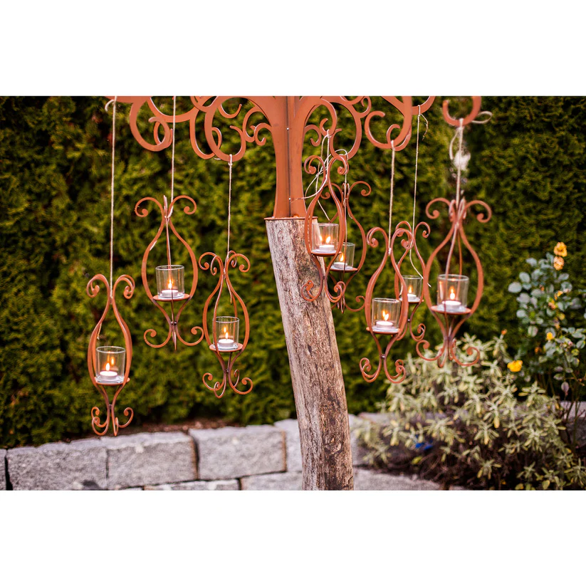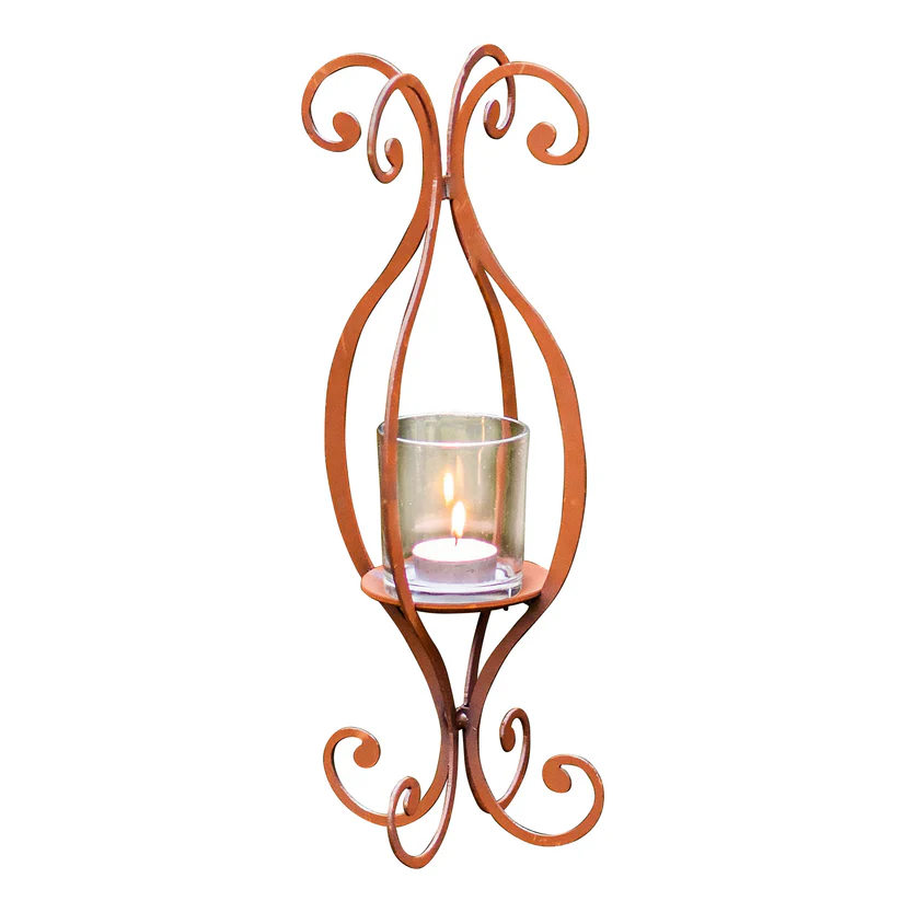 Ein schönes leicht verschnörkeltes Windlicht mit passendem Kerzenglas zum Aufhängen.