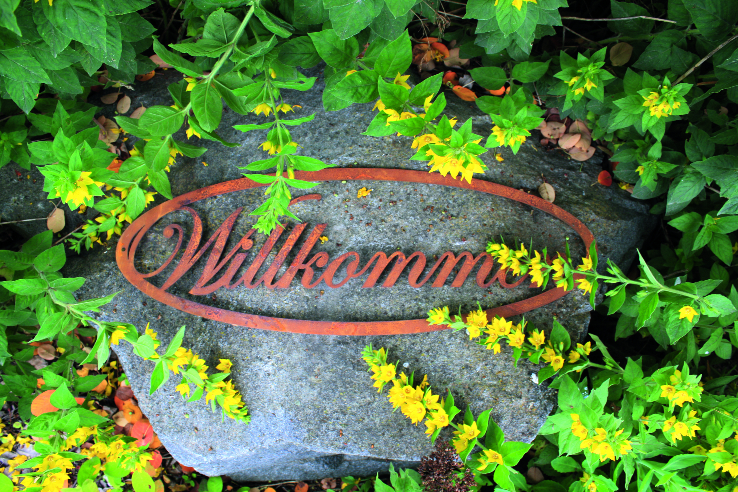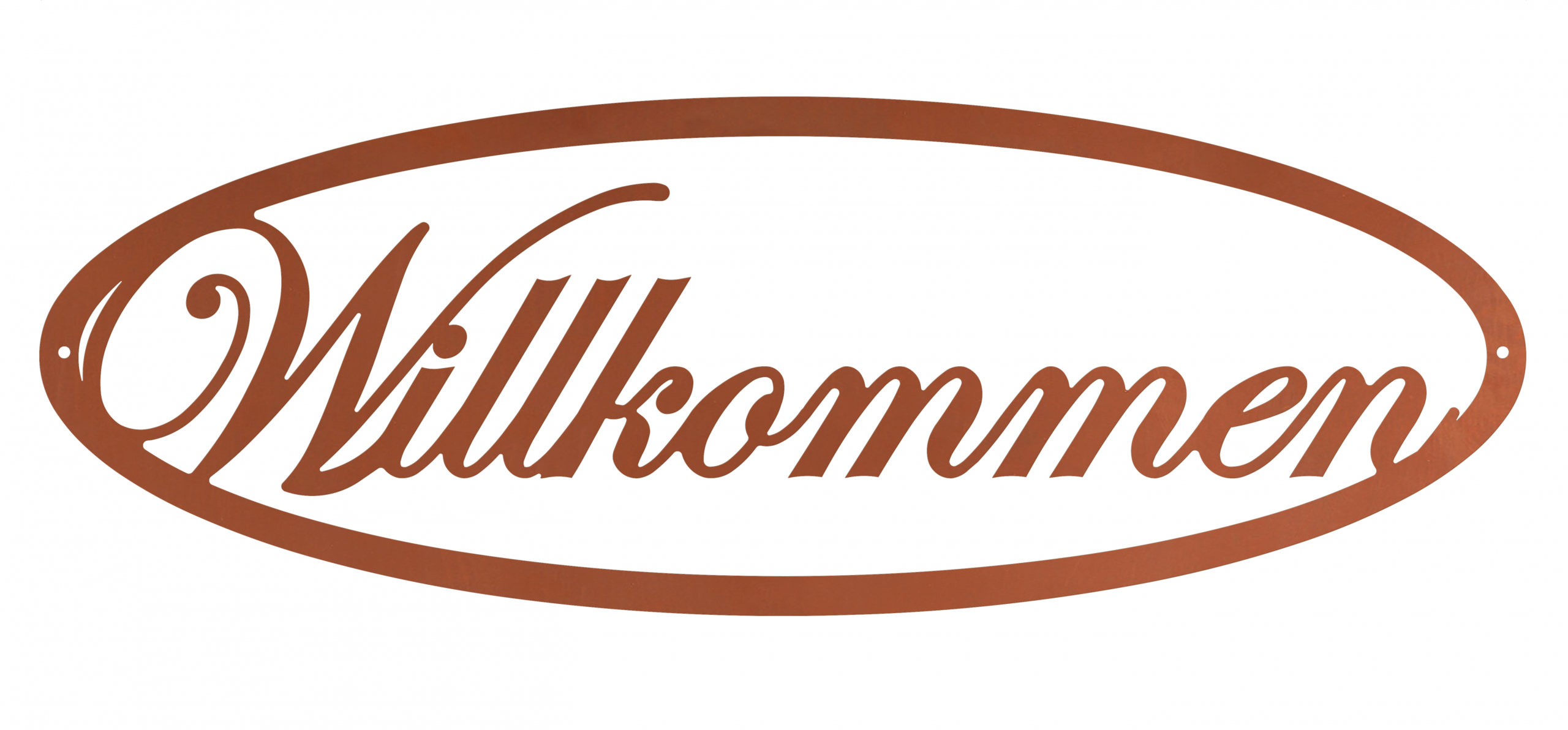Ein Willkommens-Schild aus Metall in Rostoptik.