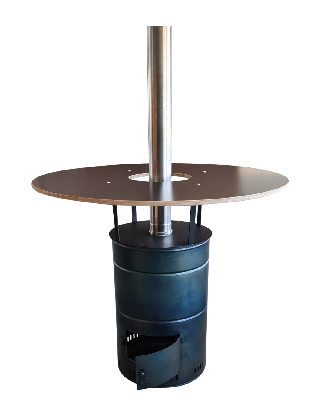 Feuerfass, Stehtisch und beheizter Stehtisch in einem. Je nach dem, was ihr gerade benötigt. Unser Feuerfass mit Stehtisch bietet Bar-Gefühl, Lagerfeuer-Feeling und einen Treffpunkt für nette Leute in einem. Das handgefertigte Feuerfass aus Stahlblech hat ein Füllvolumen von ca. 165 Litern und eine Höhe von ca. 85 cm. Durch den langen Schornstein, steht dem verweilen am Tisch nichts mehr im Wege, da der Rauch nach oben wegzieht. Jedoch sollte das Fass nur wenig mit Holz gefüllt werden. Die Tischplatte hat einen Durchmesser von ca. 120 cm und das Ofenrohr aus Edelstahl hat eine Länge von ca. 100 cm.